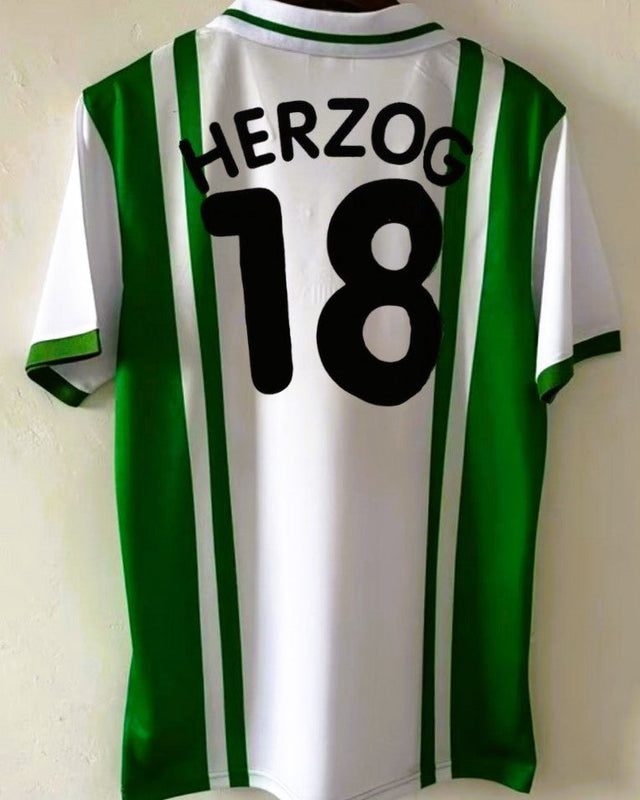 I colori bianco e verde del Werder Brema sono protagonisti di questa splendida maglia con il numero 18 di ANDREAS HERZOG. Realizzata per la stagione 1996-97, celebra una dei periodi più entusiasmanti del club tedesco guidato e trascinato dal talentuoso giocatore austriaco