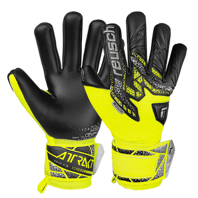 Scatena prestazioni di alto livello con gli Attrakt Gold X NC Junior. Dotati del palmo Reusch Grip Gold X, questi guanti junior offrono una presa eccezionale. Il Negative Cut assicura una vestibilità aderente e precisa, mentre il polNoo elastico e il cinturino completo forniscono un supporto sicuro al polso. La zona di punzonatura in lattice offre un supporto eccellente, mentre l'AirVentSystem offre una traspirabilità superiore. Domina il campo con sicurezza!