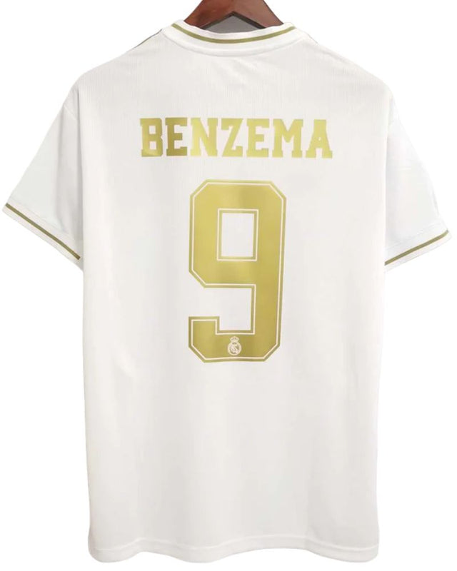 In the divine glow of gold and the purity of white emerges the 2019-20 Real Madrid shirt with the number 9 of KARIM BENZEMA. This masterpiece created by Adidas, adorned with gold number inserts and embellished with the La Liga patch, is an ode to the club's greatness and an ode to the phenomenal "Karim the dream"