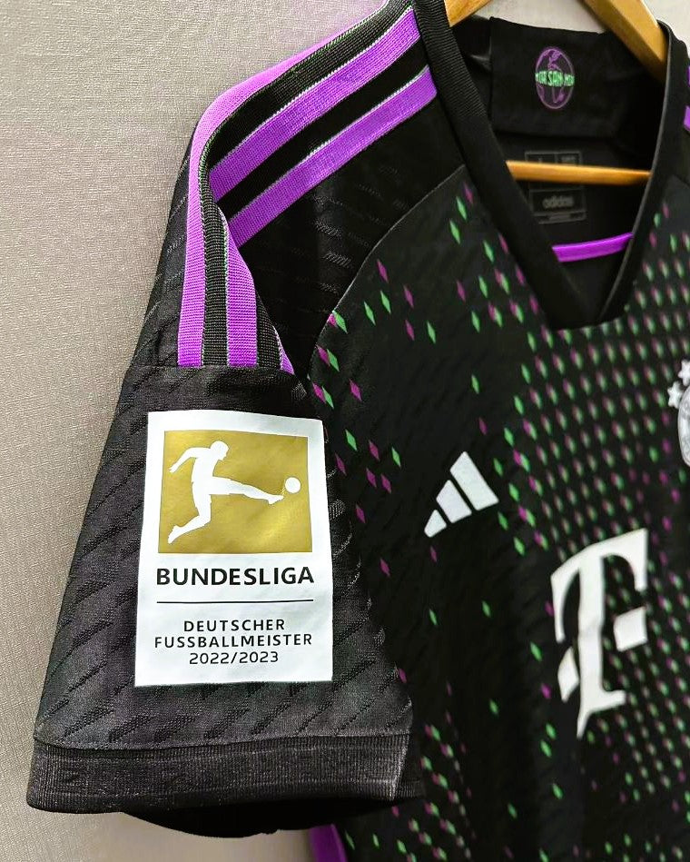 A magnificent jersey, this Bayern Munich shirt from the 2023-24 season, featuring HARRY KANE's number 9. This bold jersey is a masterpiece of innovation and design, with exquisite purple inserts and the patch celebrating victory in the BundesLa Liga creating an absolute gem