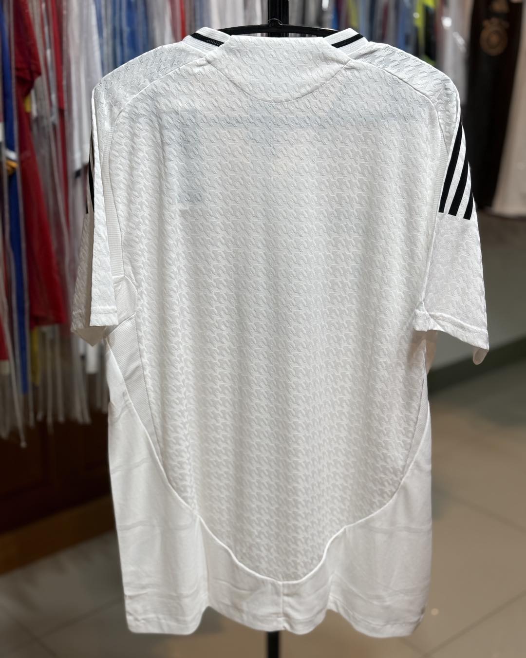 La maglia del Real Madrid per la stagione 2024-2025, prodotta da adidas, combina tradizione e innovazione. La versione home mantiene l'iconico colore bianco del club, arricchito da dettagli in nero e oro. Un elemento distintivo è la stampa pied-de-poule, ispirata al tradizionale "chulapo" delle feste di San Isidro, che aggiunge un tocco culturale al design