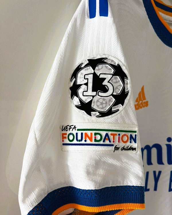 Sul palcoscenico della stagione 2021-22 emerge la maglia del Real Madrid con il 20 di VINICIUS Jr. Questo capolavoro arricchito dalle patch della Champions League è un inno alla grandezza del club madrileno, nuovamente vincitore in Europa e in campo nazionale trascinato dal fenomenale brasiliano