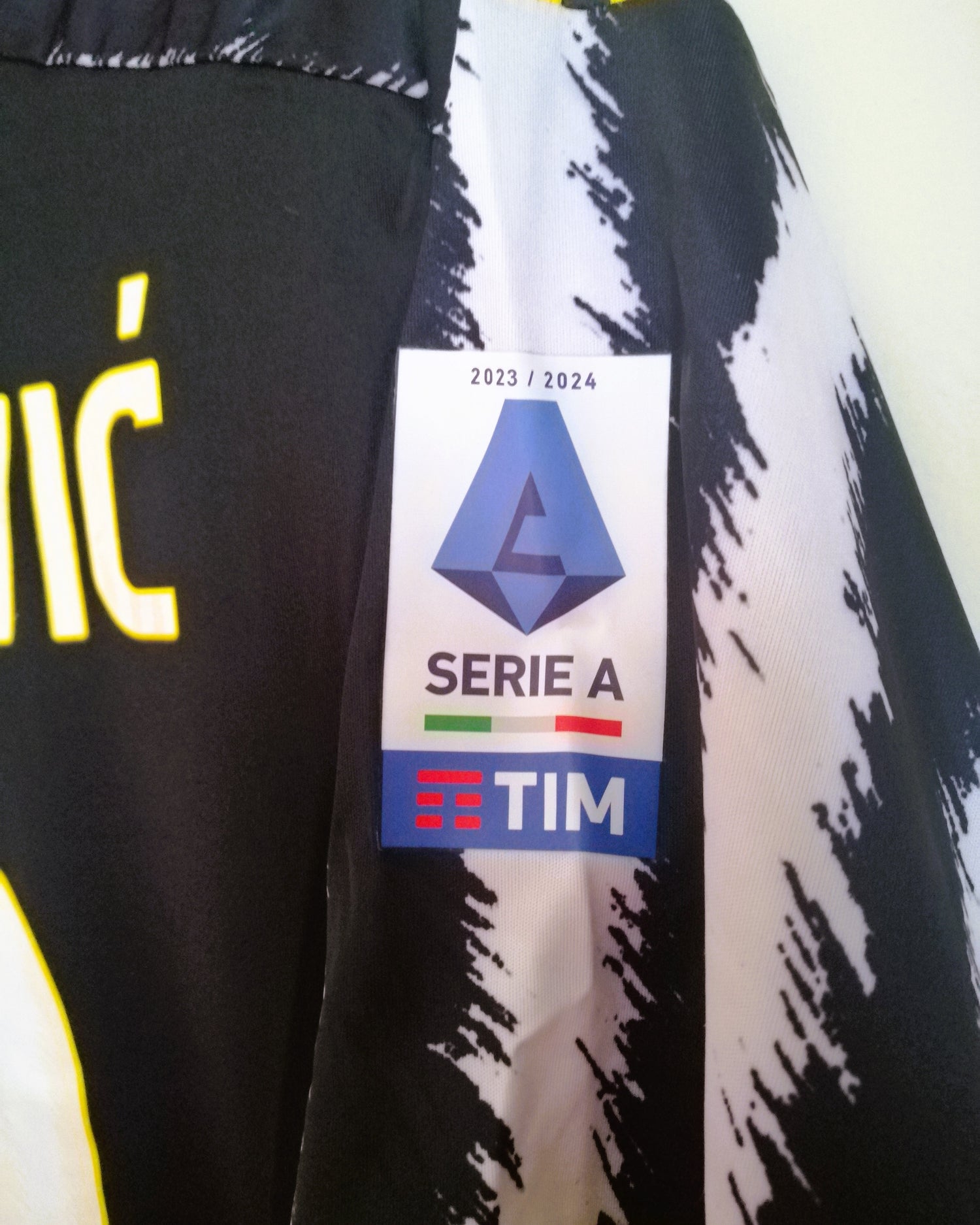 La maglia della Juventus della stagione 2023-24 con il numero 9 di DUSAN VLAHOVIC, celebra la tradizione del club bianconero votato al futuro. Arricchita con la patch della Serie A, evidenzia la personalizzazione dell'attaccante serbo riconosciuto come uno dei giocatori più forti del panorama internazionale