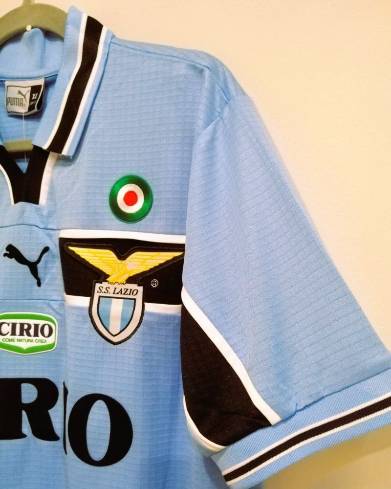 Rivivi la storia del calcio con la maglia della Lazio della stagione 1998-99 indossata con il numero 9 da MARCELO SALAS. Arricchita dalla patch della Serie A e dalla coccarda della Coppa Italia, testimonia la forza della squadra laziale trascinata dalle reti del formidabile "Matador" cileno
