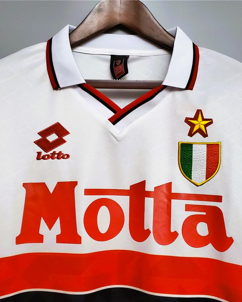 Rivivi l'epoca d'oro del calcio italiano con la maglia del Milan della stagione 1993-94 indossata con il numero 10 da DEJAN SAVICEVIC. Questo autentico pezzo di storia sportiva ha lo scudetto sul petto, testimonianza del dominio nel campionato italiano dei rossoneri trascinati dal fenomenale talento rossonero