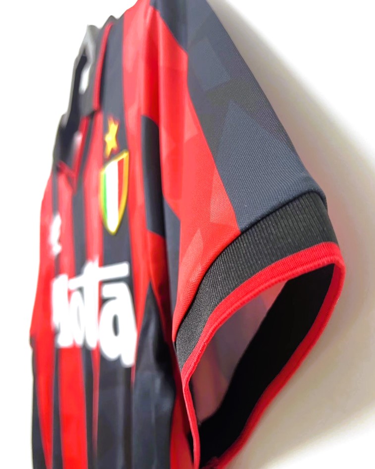 Rivivi l'epoca d'oro del calcio italiano con la maglia del Milan della stagione 1993-94 indossata con il numero 9 da MARCO VAN BASTEN. Questo autentico pezzo di storia sportiva ha lo scudetto sul petto, testimonianza del dominio nel campionato italiano dei rossoneri trascinati dal fenomenale attaccante olandese