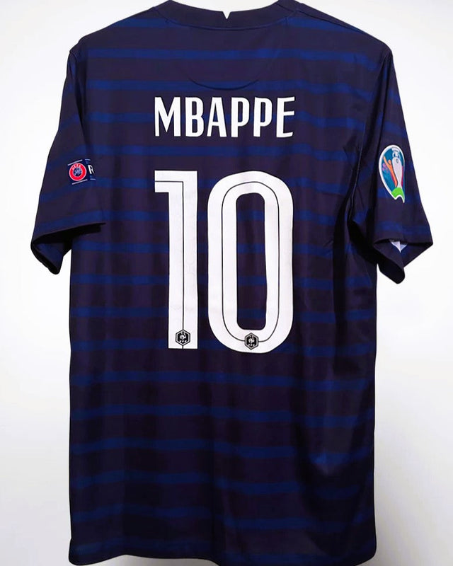 The France jersey for the 2020-21 season, featuring KYLIAN MBAPPE''s number 10, celebrates the elegance and power of the transalpine national team. Embellished with Euro 2020 patches on both sleeves, it highlights the personalisation of the phenomenal French player