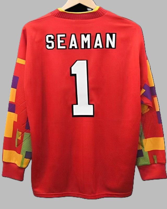 La maglia dell' Inghilterra con il numero 1 di DAVID SEAMAN rappresenta al meglio la nazionale inglese nella stagione 1996-97. Dal vivace design che ha reso questa divisa una delle più amate in assoluto, ha la personalizzazione dell'estremo difensore ancora oggi uno dei più amati e iconici in assoluto